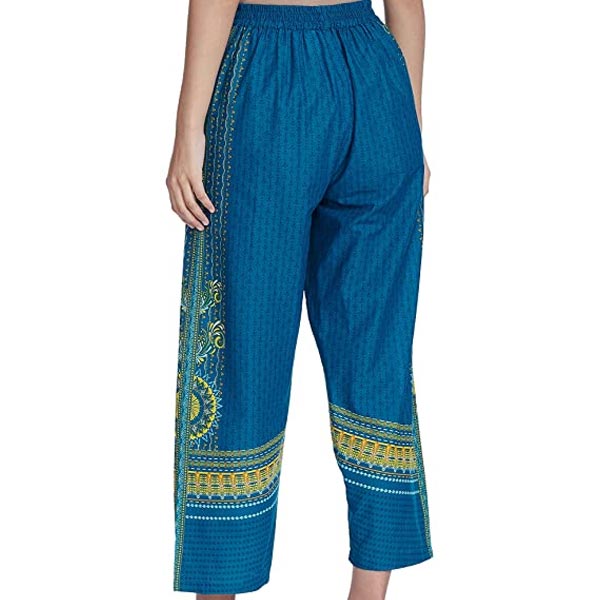 - Loose fit ankle length sapphire blue palazzo pants in mid-rise with geometric print.