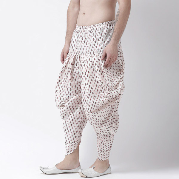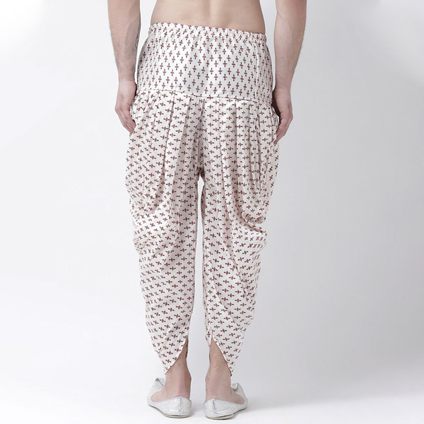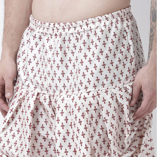 - Off-white and red printed mid-rise dhoti with gathered and pleated detail, has an elasticated waistband